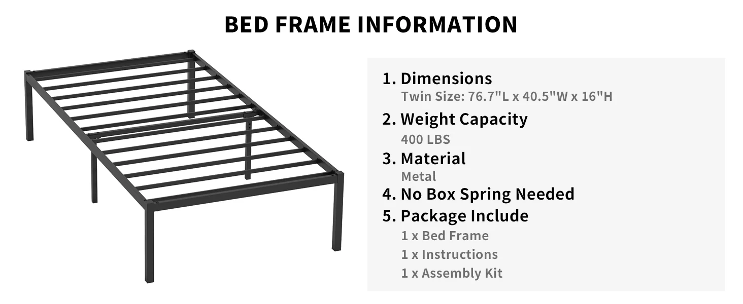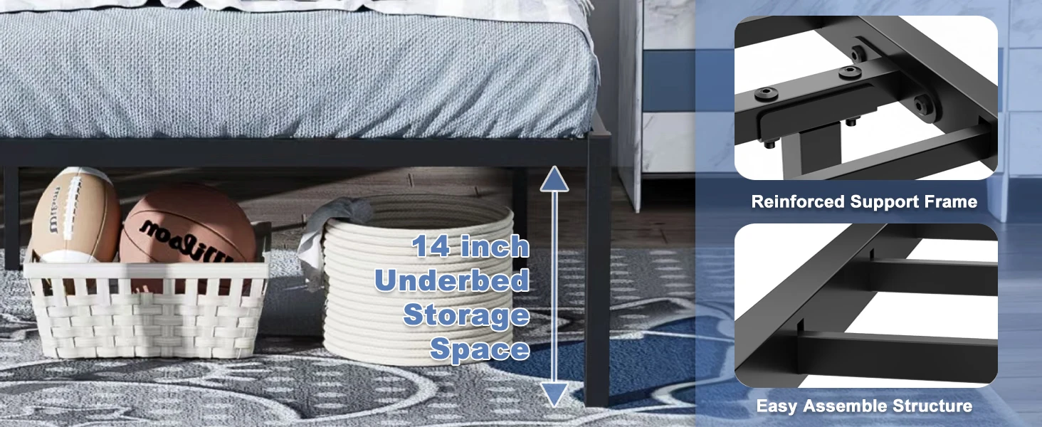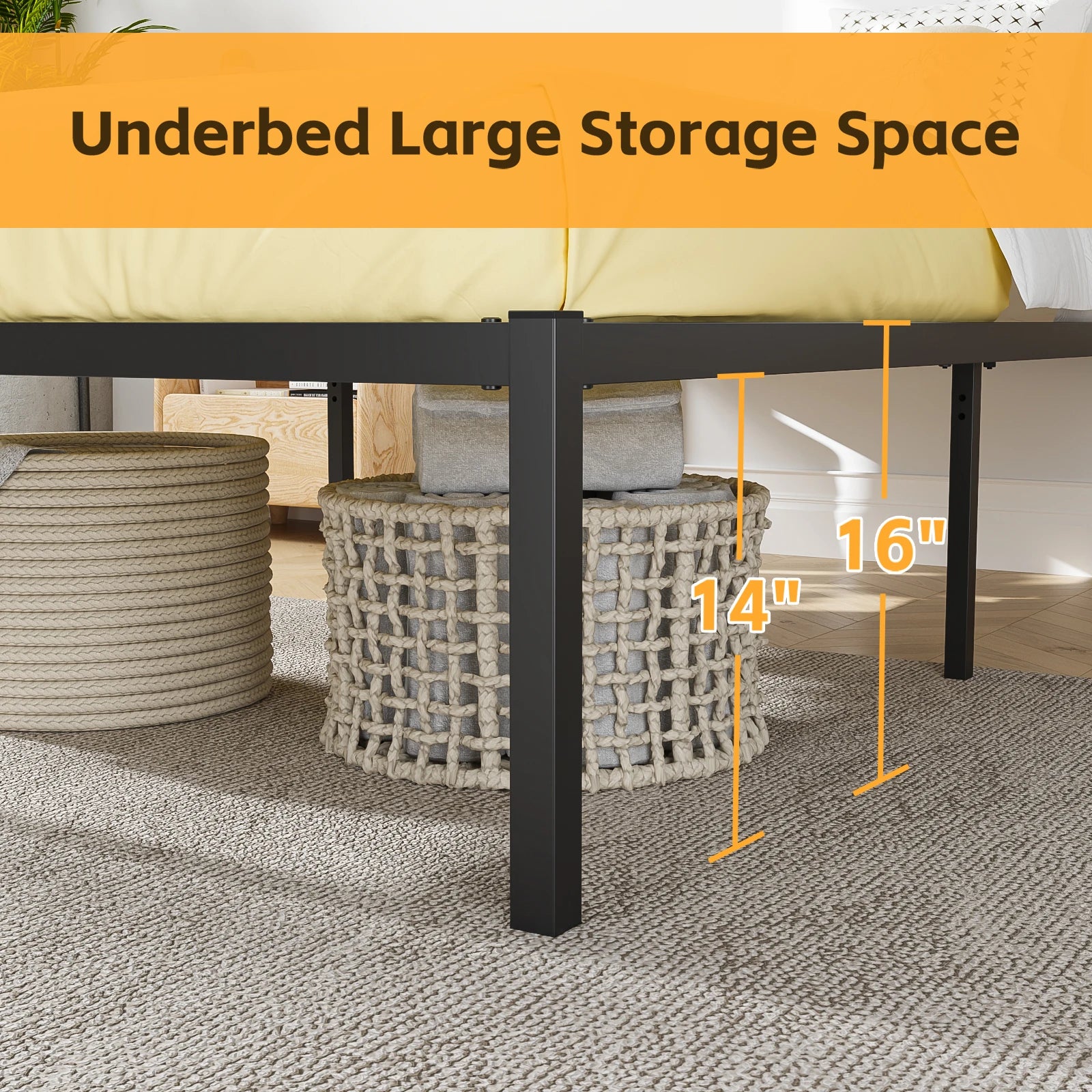 16 inches high metal bed frame provides 14 inches of under bed storage, this metal bed frame allows you to maximize the space in your bedroom.