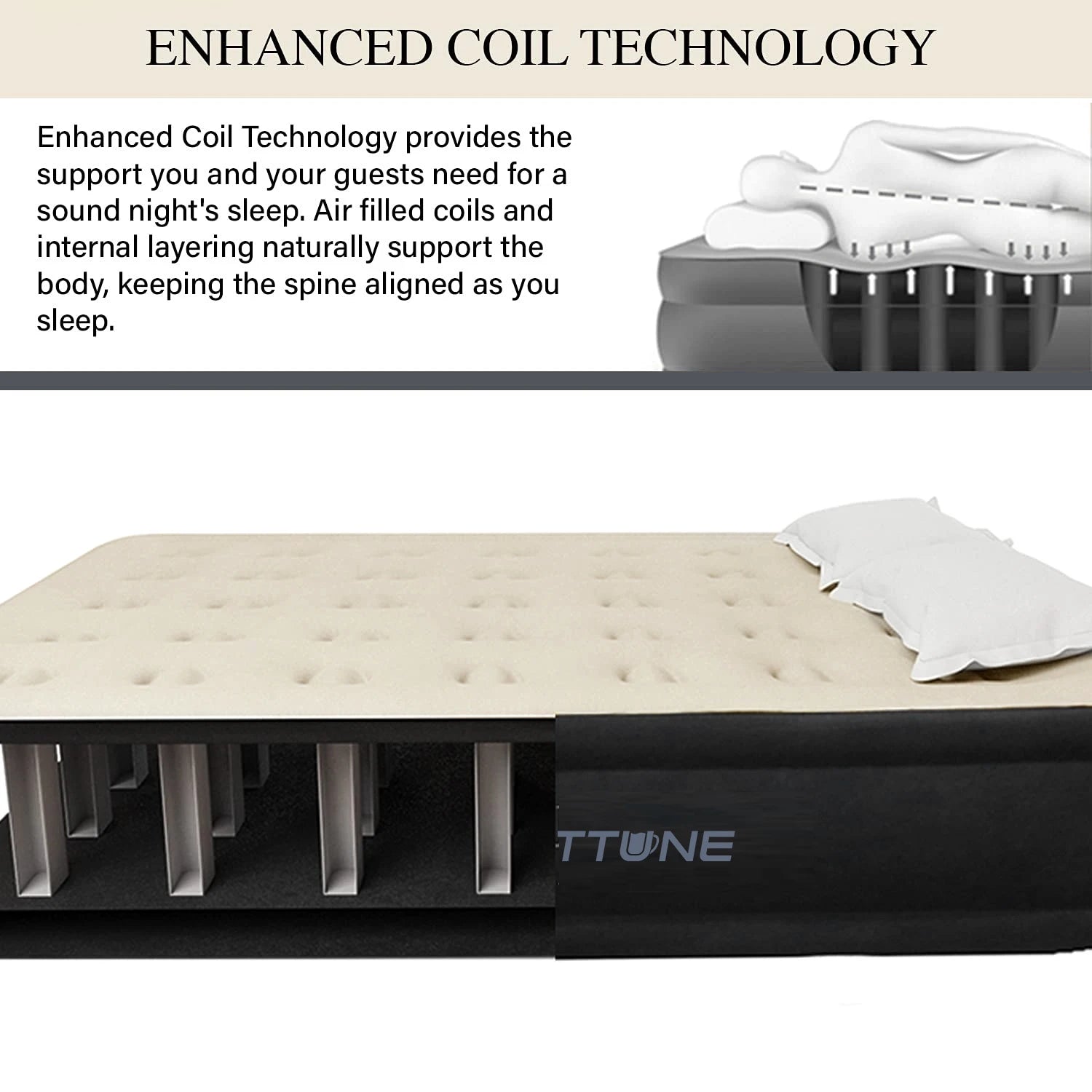WESTTUNE LUXURY QUEEN AIR MATTRESS: Experience unparalleled comfort with our Queen-sized airbed, featuring a luxurious pillow top, soft flocking layer and enhanced coil-beam construction for maximum support. Built to last with durable, waterproof, and puncture-resistant materials, this air mattress is your go-to solution for a restful night's sleep.