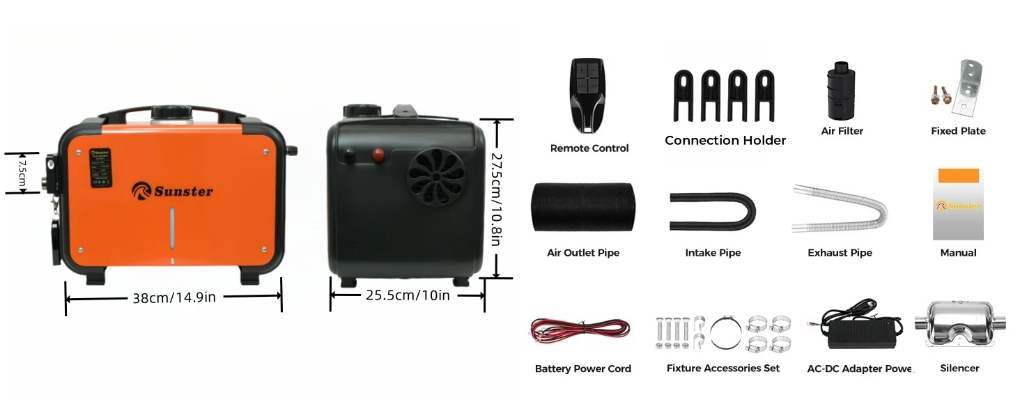 ✅Packaged included:1 x Air Heater Host,1 x 5L Fuel Tank,1 x Remote Control,1 x Air Filter,1 x fixed plate,1 x Air outlet pipe,1 x Intake pipe,1 x Exhaust Pipe,1 x Battery Power Cord,1 x Fixture Accessories Set,1 x Silencer,1 x AC-DC Adapter Power,1 x connection holder,1 x Manual