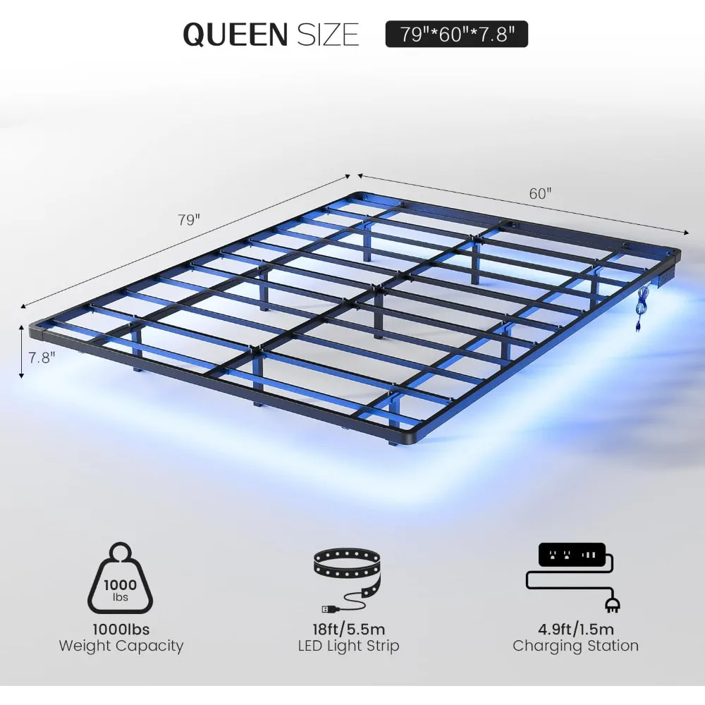 This product description highlights the features of the OLEVS Floating Bed Frame Queen Size: - Modern Floating Design: Enhance your bedroom with a contemporary floating bed effect. The bed is supported by internal legs on a reinforced main frame, with three side light strips adding a modern aesthetic. - Under-Bed Smart LED Lights: Customize your ambiance with under-bed Smart LED Lights. Select from various colors and patterns, controlled easily with a key control, for an enjoyable sleep environment. - Convenient Charging Station: Keep your devices charged and accessible with a built-in Charging Station. It includes 2 AC outlets, 2 USB ports, and 1 type C port, making it easy to maintain an organized sleep space. - Sturdy, Stable, and Durable Construction: Designed for durability, this queen platform bed offers stability with 11 metal slats and 9 thick legs. The tested connections ensure long-lasting strength. - No Box Spring Needed: Simplify your setup with the OLEVS Floating Bed Frame, which does not require a box spring. Place your mattress directly on the frame for a comfortable and stylish sleep space once assembled. - Easy Assembly and Reliable Service: Set up is straightforward with detailed instructions. All components arrive in a single box with clear labeling and instructions, making it easy for one person to install.