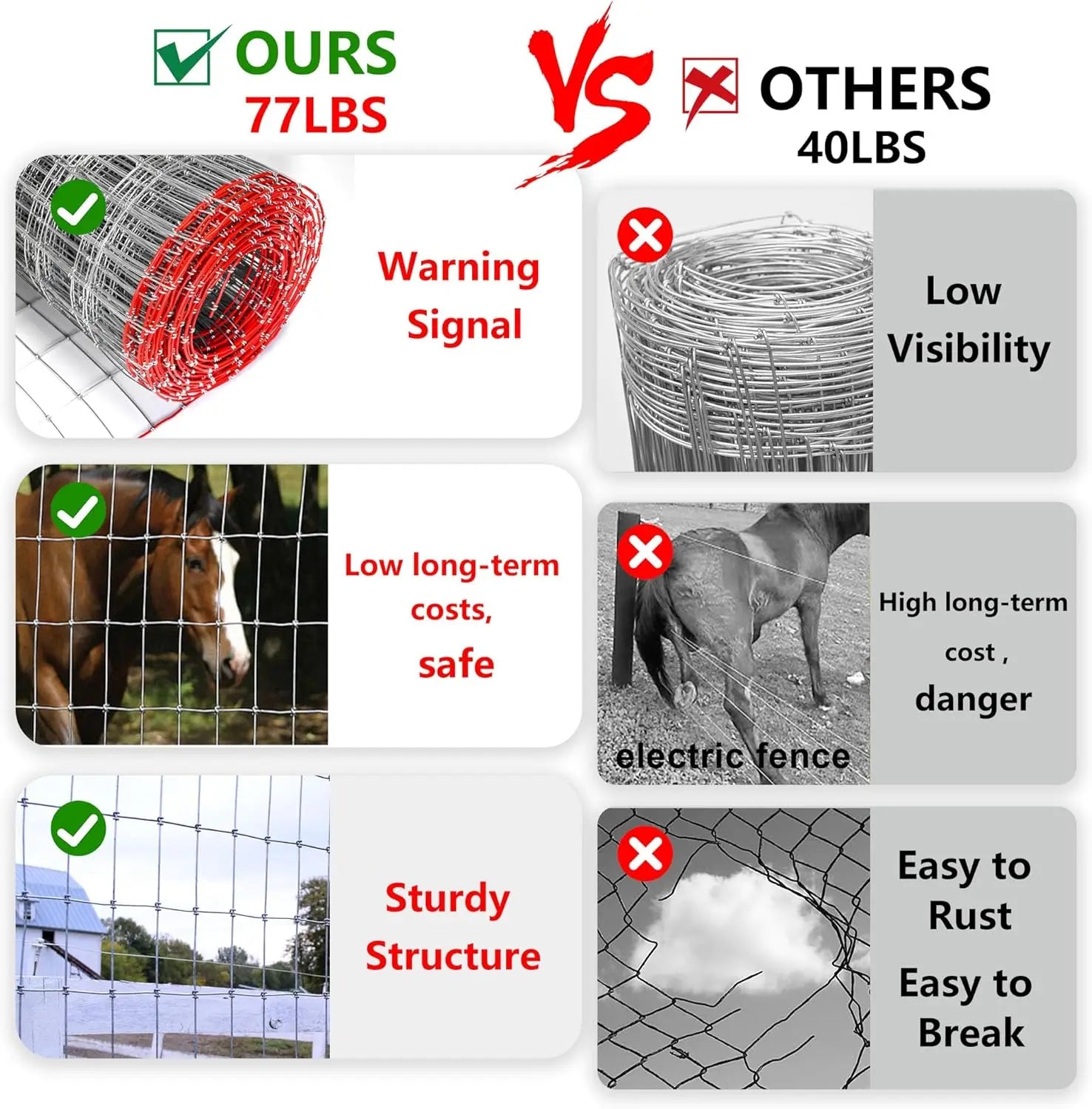 - 【Safety, High Visibility】Heavy duty farm fence is topped with high-visibility red horizontal wire to minimize animal collisions with the fence, The smooth side of our Square knot helps prevent injury to your pet or people.